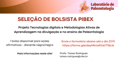 O Laboratório de Paleontologia está com seleção aberta para uma vaga de bolsista PIBEx para atuar no projeto de extensão "Tecnologias digitais e metodologias ativas de aprendizagem na divulgação e no ensino de Paleontologia". O plano de trabalho do/a bolsista encontra-se em anexo, no final desta página.